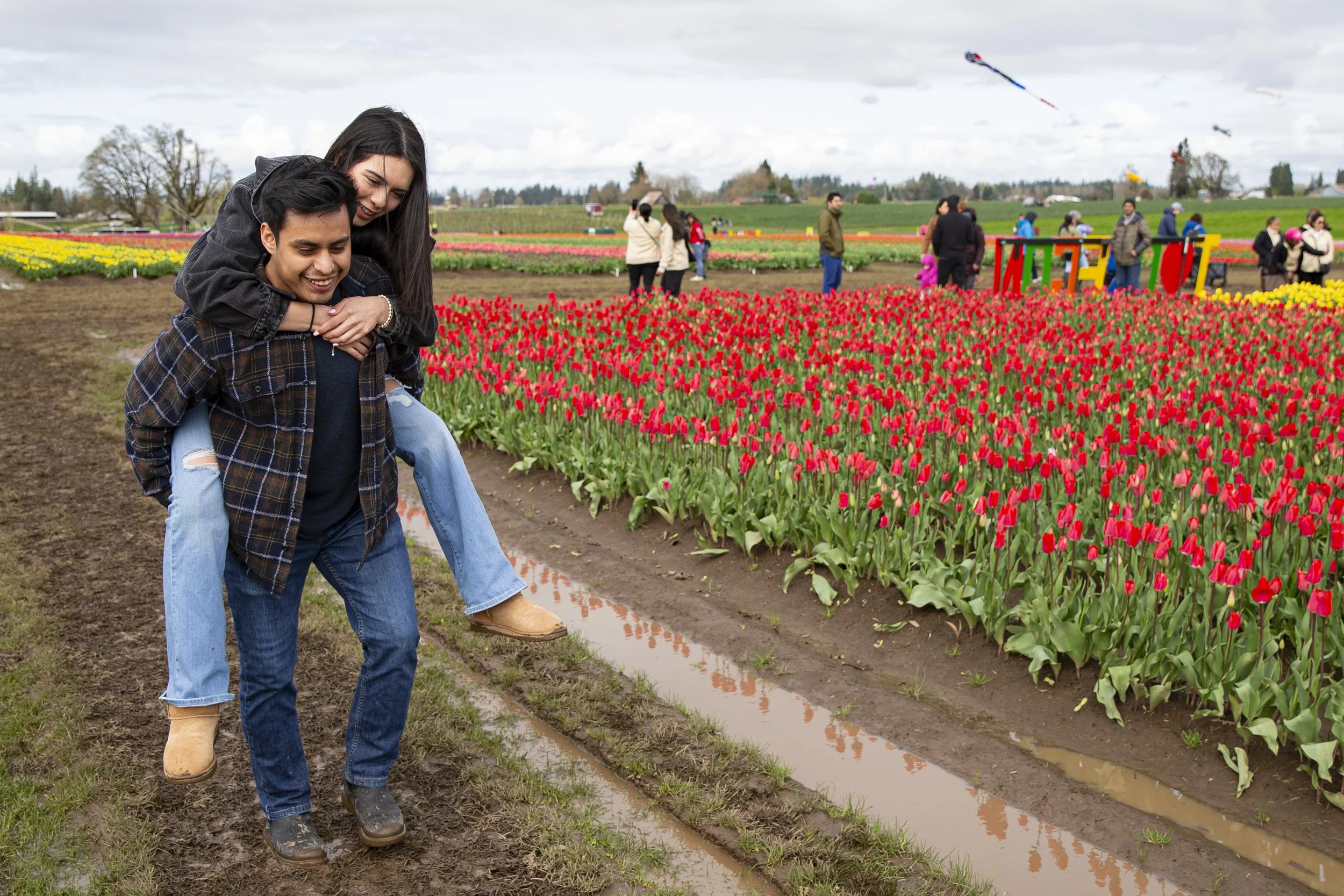 Alex Pineda carries his partner Irene Martinez across the muddy farm at the Wooden Shoe Tulip Festival on Saturday.