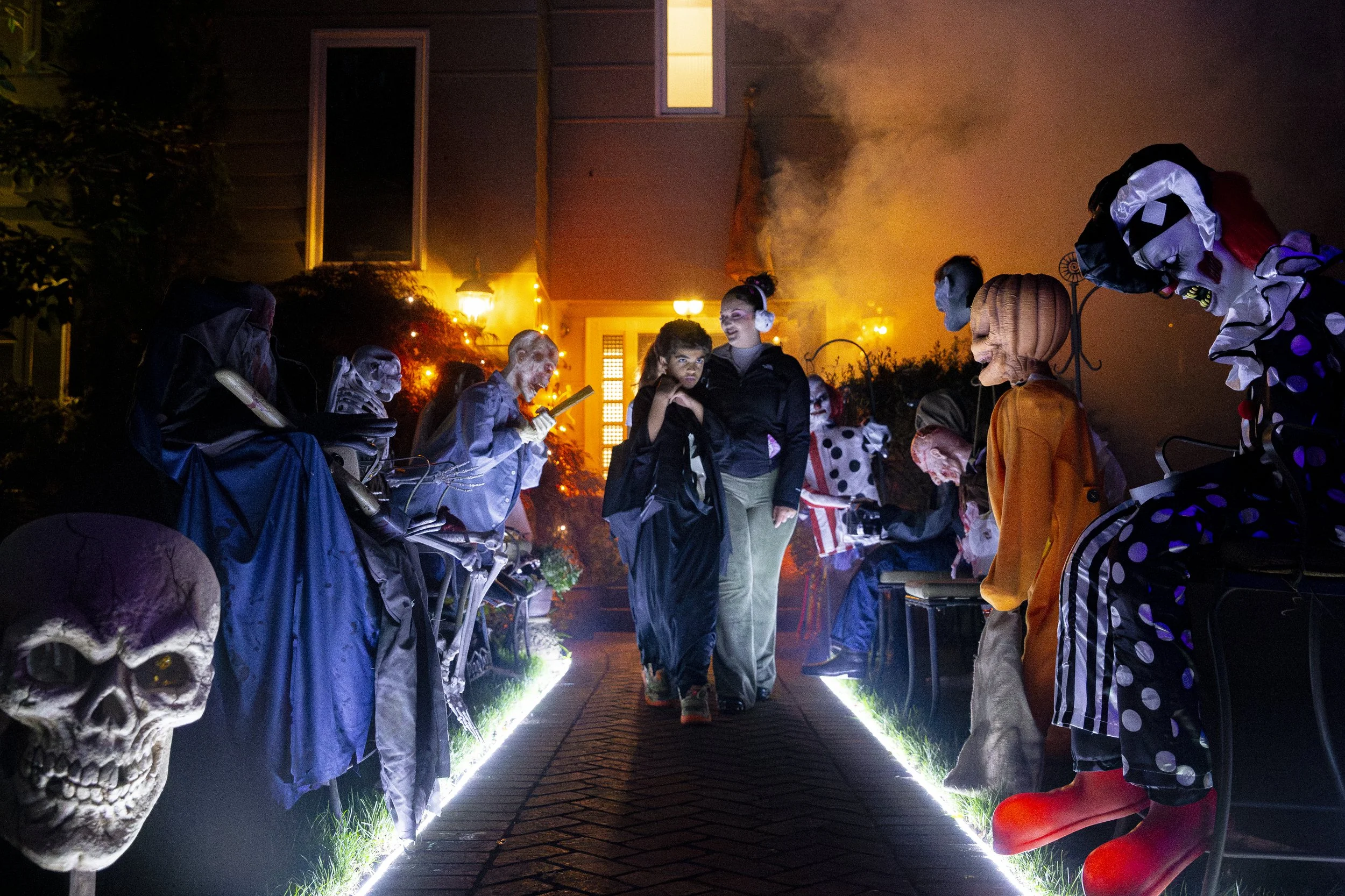 Sonan Gerad, right, walks her younger brother Archie Casewell, 10, down the aisle of animatronic monsters during the 12th annual Fairmount Halloween parade on Tuesday, Oct. 31, 2023 in Salem, Ore.