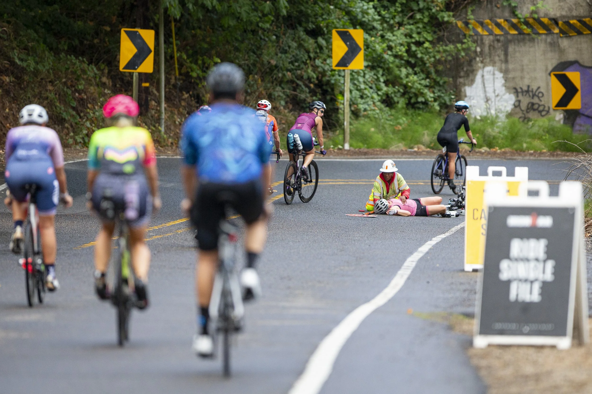 Flagger Lisa Roberts helps Mandy Anderson after an incident on River Road South during the Ironman 70.3 Oregon on Sunday, July 21, 2024, in Salem, Ore.